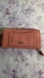 This is a gorgeous pebbled leather wallet new without tag. Silvertone hardware. Has a pocket on front exterior. Has three compartments. Middle compartment is zippered. Other two compartments have six cards slots each. Interior is contrasting burgundy leather. The pink and the burgundy are beautiful together. Smoke and pet free home.