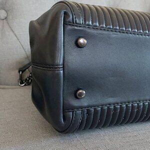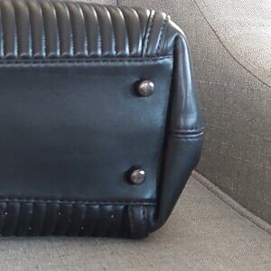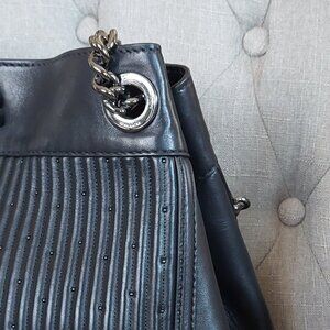 This gorgeous black shoulder bag is in EXCELLENT used condition. It is made from soft supple Nappa leather and is quilted with petite and classy small gun metal studs on the front. Dark burgundy interior lining with the Coach name embroidered as I purchased it from a boutique and not an Outlet. Gun metal hardware in great shape - very minor scuffs on the feet. Handles have a 9 ½” drop which makes the bag sit very comfortable under the arm and easy to open and retrieve items. No stains, smells or leather damage. The only reason I am selling it is because of a change in lifestyle. It will be sold with its original Coach dust bag. Style No. 26834 12 3/4” x 11” x 5 3/4”