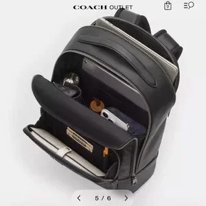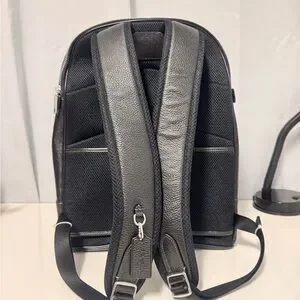Sleek and stylish Coach backpack. Pebbled leather finish. Silver-tone zippers and logo. Ideal for everyday use.