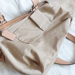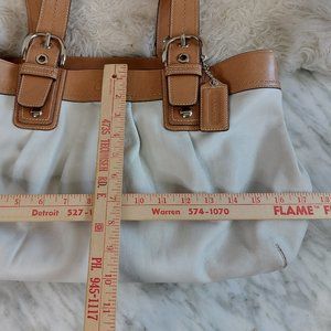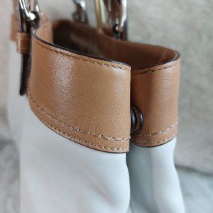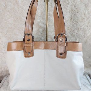 Check out this Coach F13733 Ivory and Tan Soho Pleated Leather Buckle Shoulder Strap Large Tote Purse in very great pre-owned condition, the bag has very minor lightly stains on the font but no rips on it, the lining has no rips and stains on it. this bag is very roomy perfect to keep all the essential.