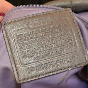This Coach F16178 crossbody bag is crafter from a silver/purple leather. It's a medium-sized shoulder bag that is studded, embossed, and features branded logo buttons throughout. Lined in a beautiful lilac purple. Zip closure.