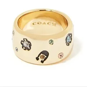 This everyday chunky band ring by Coach features signature motifs and colorful mixed gems. Made from brass and glass crystal. Includes Coach pouch. 10.16mm ring face length, 11mm ring band width.