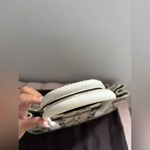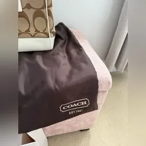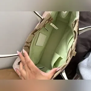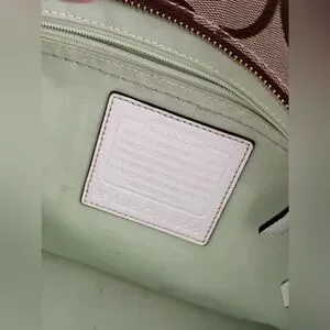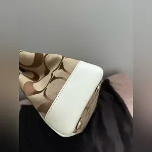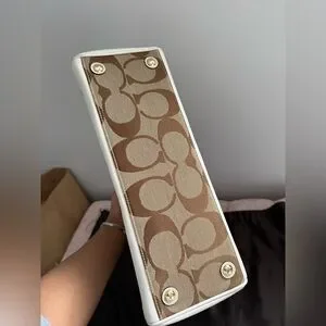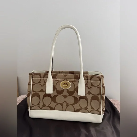 Coach Hampton Signature Jacquard tote bag featuring khaki canvas with white leather trim.