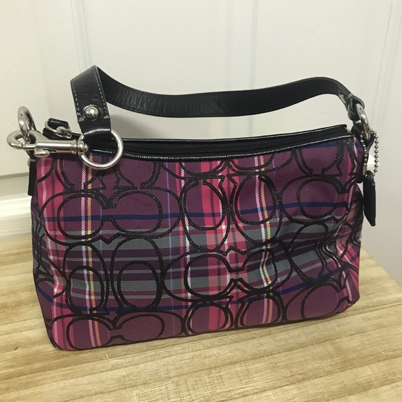 Coach Handbag with Purple and Magenta Plaid Pattern and Black Monogram. Never Used.