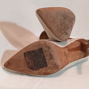 Shoe is white, pointed toe, gold chromed coach tag detail on heel. Embossed leather. Crocodile look.