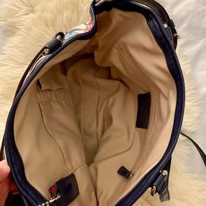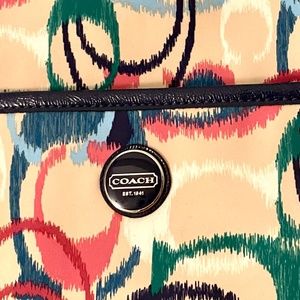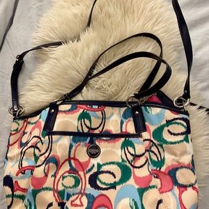 Zip-top closure. Inside: beige fabric lining, zip pocket, cell phone pocket. Exterior multi-function pockets front and back. Includes original detachable long cross-body strap and original dark blue & bright pink Coach hangtags.
