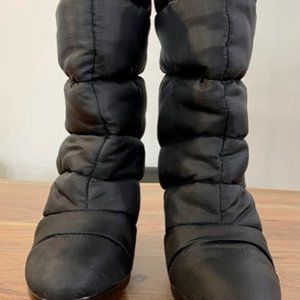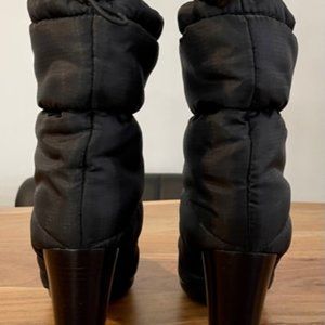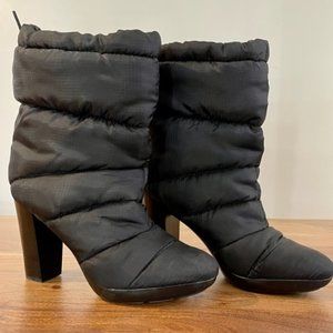 These super warm high-heeled snow boots from Coach are perfect for looking fierce in the wintertime. These boots have only been worn once and are in excellent condition. Features a 4-inch wood heel and a stretch cinch at the top.