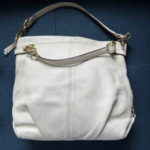 Lightly used Coach leather purse in ivory, with a lilac interior. This purse features a shoulder strap, plus handles, accented with gold chain and buttons, and has minor wear. The zippered interior includes a phone/sunglass pocket, passport/document sleeve, and one zippered pocket to protect valuables.