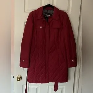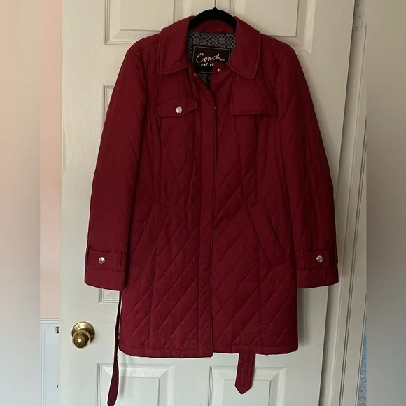 Coach Coat - burnt red color - quilted style design/print - 2 side pockets - snap button closure - fabric coat tie - signature Coach pattern lining inside - only worn a few times - 18” inches pit to pit - 33” inches length - excellent preloved condition
