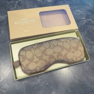 Authentic Coach Signature Eye Mask in classic khaki canvas with brown trim. A chic and practical accessory for travel or relaxation, offering both comfort and style. Comes in original Coach gift box with tags.