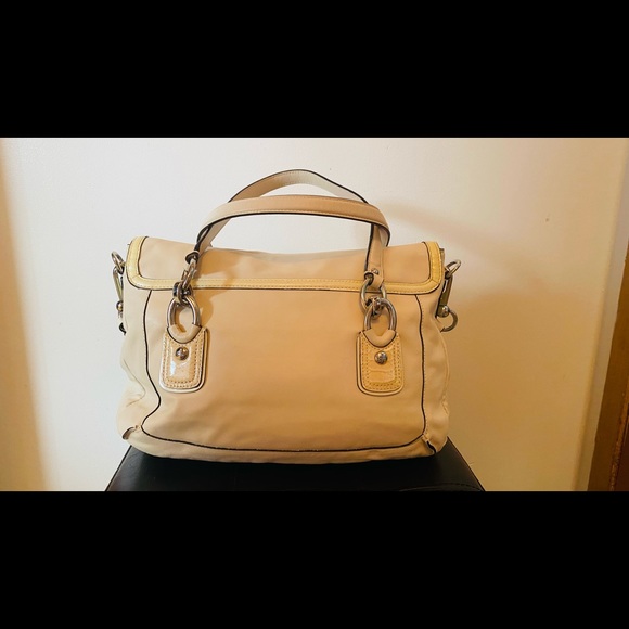 Excellent condition bag, well taken care of. Light cream with pink satin lining. Authentic Coach