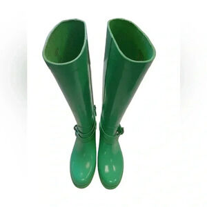 Bright green the " Lori" boots are rubber and have silver toned hardware. Featuring subtle call outs and round toes.