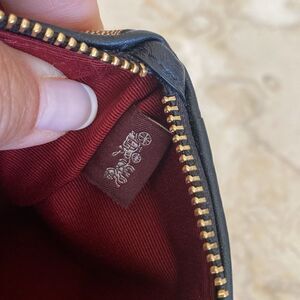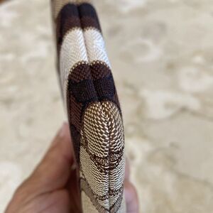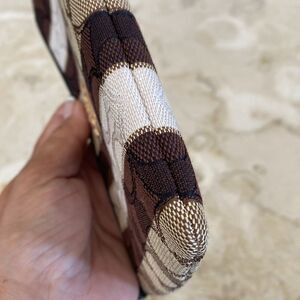 Beautiful unused Coach wristlet wallet in signature jacquard and brown leather. Interior is lined with 2 credit card slots