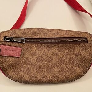 Like new, used once, authentic Coach belt bag. Signature coated canvas plus hot pink polished pebble leather. See pics for various pins and embellishments. Purchased in Coach store on Bloor Street, downtown Toronto in February, 2020. (Selling on eBay for $500 US.) Dimensions: 10"x5"x1.3/4" (WxHxD).