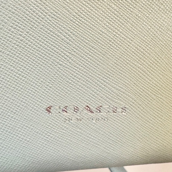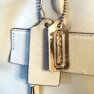 Elegant and versatile Coach purse in beautiful light blue genuine leather. Can be worn two ways — as a crossbody with the detachable long strap, or by hand using the shorter handles.