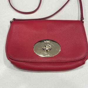 Coach red leather Liv pouch crossbody bag with gold toned hardware, turnlock closure, front exterior pocket under the flap, back exterior slip pocket, separated main storage area, long non removable/non adjustable crossbody strap. Fabric logo lined interior. Good pre owned condition with one darker mark on the back (photos). Some scratches/wear to the turnlock. Missing hang tag. Please see photos, measurements are for reference only. Reasonable offers welcome!