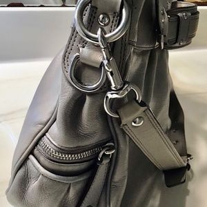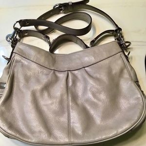 Preowned, Grey leather with a shoulder and a crossbody adjustable strap in good condition and very clean . Visible signs of wear , Number B0968-13250 Coach Madison convertible. Medium large.Authentic Coach bag. As is
