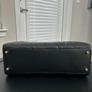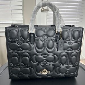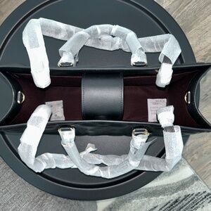 Signature smooth leather Inside zip pocket Magnetic snap closure fabric lining Handles with 4 1/4 drop Strap with 11 1/2 drop Four protective feet at base 14 1/4 (L) x 11 (H) x 5 1/2 (W) Style No. CY672