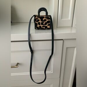 Stylish mini bag with bold animal print. Features black leather accents. Gold hardware adds elegance. Perfect for any occasion.