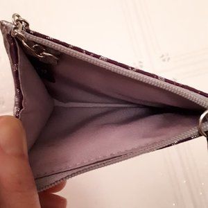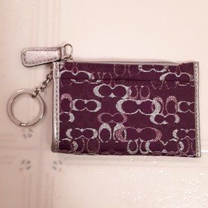 Keeps keys, cards, or coins! Has a zip-top closure for main pouch, fabric lining, and key ring attached (can be hidden in pouch). Small and portable.