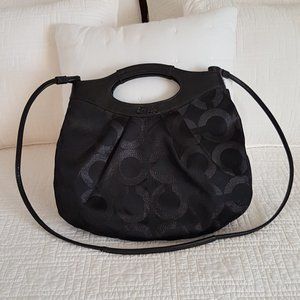 Coach Monogram Bag in Black Fabric. Monogram Has A shimmer To It. Has Leather Trim And Leather Top Handles and Long Leather Body Strap. Inside Fully Lined In Purple Fabric With One Zip Pocket And Two Slip Pockets. Light Weight, Dress Up Or Down With This Bag. This Bag Is Gorgeous. Measures About 12 L X 12 W in Inches. Long Handle Measures About 45 Inches.