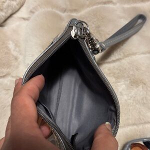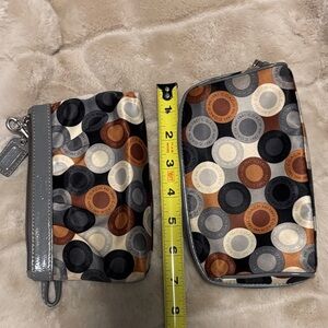 Elegant wristlet with multicolor circle design. Features black, gray, brown, and cream tones.