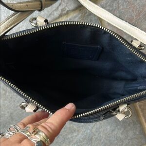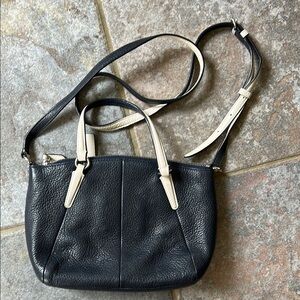 Discover the elegance of the Coach navy Pebbled Leather crossbody bag. a perfect blend of style and functionality. Crafted from high-quality pebbled leather, this purse offers a sophisticated look with its sleek navy finish. The handles are off white outside and navy on inside. Strap is also off white and navy. Ideal for everyday use, it features a spacious interior and a timeless design that complements any outfit. Measurement of strap is at the shortest hole. Clean interior. The last pic shows the strap where the cream leather doesn’t go to edge. It is not noticeable. I purchased 2nd hand that way and hardly used it.