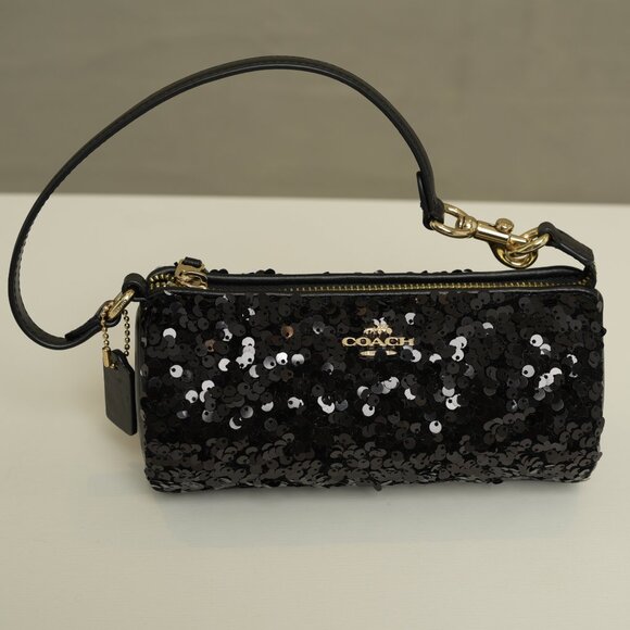 Stylish and eye-catching black sequins barrel bag from the classic Coach Nolita line. Leather handle and side panels are beautifully combined with sequins that add a touch of sparkle. Worn only once, looks almost new! The bag that can be worn on the shoulders or handheld adding a bit glamour to a special event or a night out.