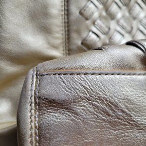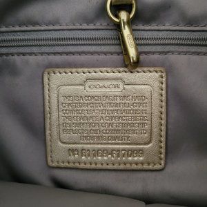 Metallic gold (subtle) Coach bag - selling as GUC due to small pen marks on inside lining and very slight wear on bottom corner as shown, but otherwise EUC. W/D/H is 10"×6"×12". Retails $300+