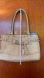 Classic satchel by Coach in bone colour leather. A great size and colour for every day use, with pebbled leather for easy care! So many details: tassel, hang tag, braided leather trim and embossed "Coach" logo. Silver tone hardware. Interior has one zip pocket and two open pockets. Zip closure. A well cared for purse with minor marks, difficult to see without the ring light, see photos.