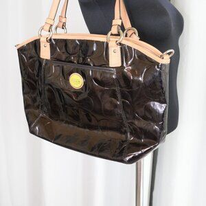 Upgrade your handbag collection with this Coach Peyton patent leather tote, a perfect blend of sophistication and functionality. Crafted from glossy black patent leather with signature Coach details and contrast brown leather accents, this roomy tote is ideal for everyday use, work, or travel. Its structured silhouette and spacious interior provide ample storage while maintaining a sleek and polished look. Shoulder bag straps (Does not come with a crossbody strap). SIZE: 10.5" x 14" (approx)