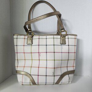 Genuine Coach bag (F1220-F20093) cream background with tattersall multi-colour plaid design. Top zipper closure, two handles. One outside pocket. One zippered inside pocket. Pink interior lining with 2 slots. Size 14 inches wide by 10.5 inches high by 2.5 inches across the base. Barely used, great condition.