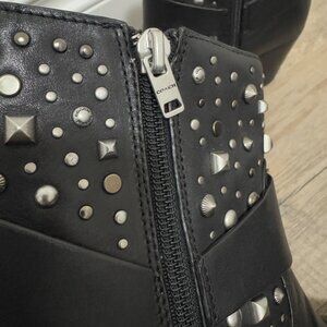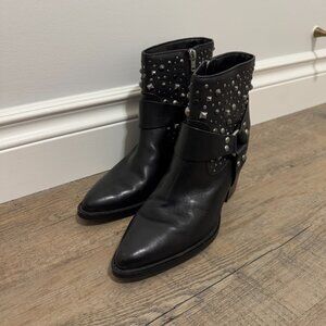 This Western-inspired bootie adds a touch of rebel attitude to any look. Crafted of smooth leather, it’s embellished with triadic strap detailing, harness ring hardware and moto-inspired rivets for an industrial feel.