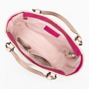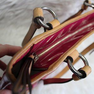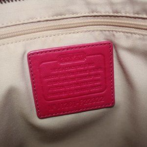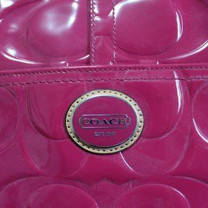 Authentic Coach Pink Peyton Embossed Patent Leather Tote Handbag with top zipper closure.