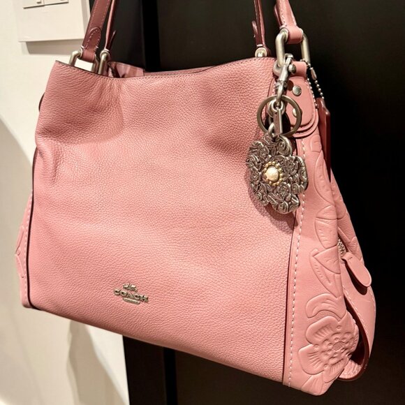 Absolutely stunning and rare Coach Shoulder Bag in soft blush pink. Features beautifully tooled leather floral accents, genuine pebbled leather body, and silver concho-style hardware. This is a highly collectible piece from Coachβs Western-inspired Legacy collection.