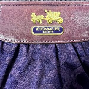 This Coach clutch in a striking purple hue features a textured pattern that adds a touch of sophistication. Accented with gold-toned hardware and a brown leather trim, it offers a chic and versatile style. The wristlet strap provides convenience, making it perfect for both casual outings and elegant events.
