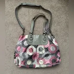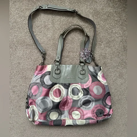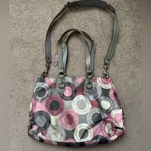 Coach purse. Can be worn as cross body, on shoulder, or without long strap. Has some staining from rubbing against clothes and on bottom from being placed down