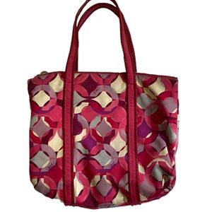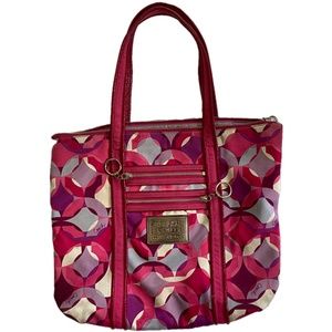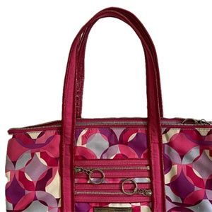 Moderately used, Coach purse from the Poppy Collection. The exterior is pink, white, and purple, with two front pockets and faux pink leather on the handle. The inside is a light purple satin material with two small-sized pockets and one larger pocket.
