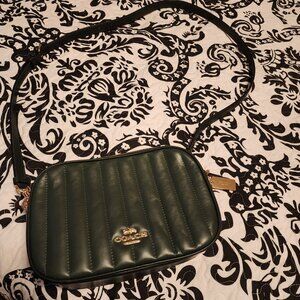 New but no tags, Coach crossbody bag. Luxurious soft dark olive green leather with gold accessories. Bag dimensions 10" × 6.5 and 3" deep. Strap is 48" total length.