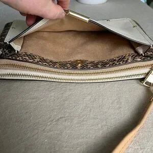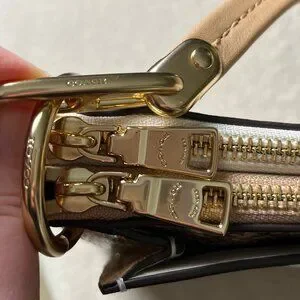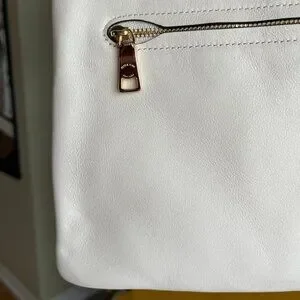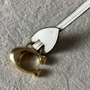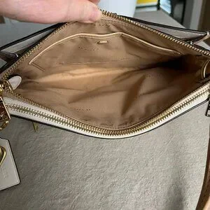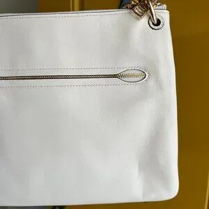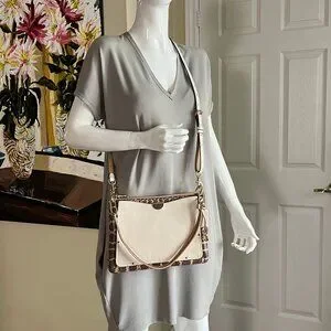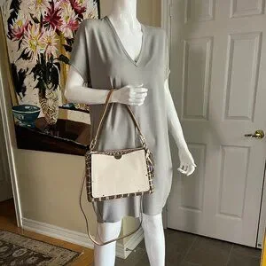 Elegant Coach crossbody bag. Features white front with brown patterned trim. Includes adjustable strap.