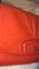 Chic Coach wristlet in vibrant coral leather. The color is somewhere between burnt orange and red. Perfect for essentials. Stylish and compact design. I used a fabric pen mixed with polish to cover any wear spots. You can see the spots with the flash in the last two pictures more than anything. Look closely at the last picture she has lots of life let in her and looks quite good on the inside.