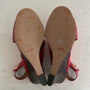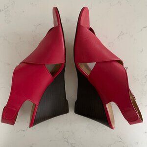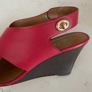 Coach Rosanne Wedge Manmade Cross Strap Sandal w Turnlock Gold Hardware in Red + Brown Heels