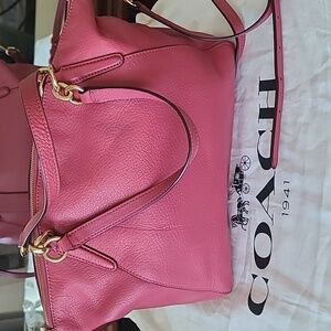 Chic Coach shoulder bag in rose leather. Features gold-tone hardware and elegant design. Perfect for any outfit.