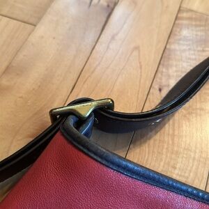Lovely leather Rugby Legacy Coach Bag. Colour Block of red, tan and navy. Has metal Coach tag. 2 exterior pockets. Zippered interior with zippered pocket and 2 open pockets.