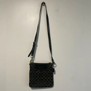 Coach Signature Black and Brown Jacquard Fabric Crossbody Bag with Leather Trim
