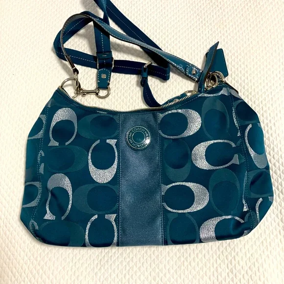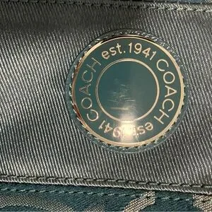 Coach signature bag in beautiful aqua blue color. 2 open pockets and 1 zippered inside bag. New without tags. Also includes strap to use as shoulder bag. Size is 15.5” x 9” x 5”.