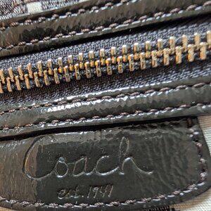 Coach vintage purse, signature jacquard bag, black patent leather trim, Coach shoulder bag, style 13291, Y2K designer handbag, classic Coach logo, Mississauga closet, retro Coach purse, quiet luxury accessory