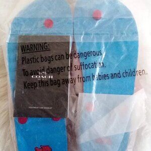 From beach days to poolside lounging, the Coach Signature Print Bold Pink Slip-Ons are the perfect footwear to add a touch of designer flair to your summer wardrobe. They are comfortable & sturdy. The coach monogram signature logo is printed on the EVA footbed, the inner heel area has Coach printed in blue letters. There's also a coach logo on the straps of both slippers. This item is authentic.