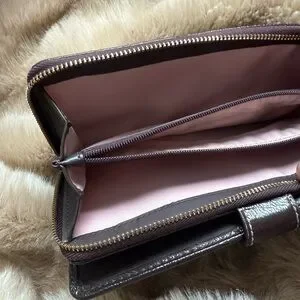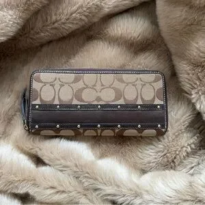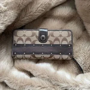 Authentic Coach long wallet in classic signature monogram canvas with brown leather trim and gold-tone stud details — perfect Y2K aesthetic ✨