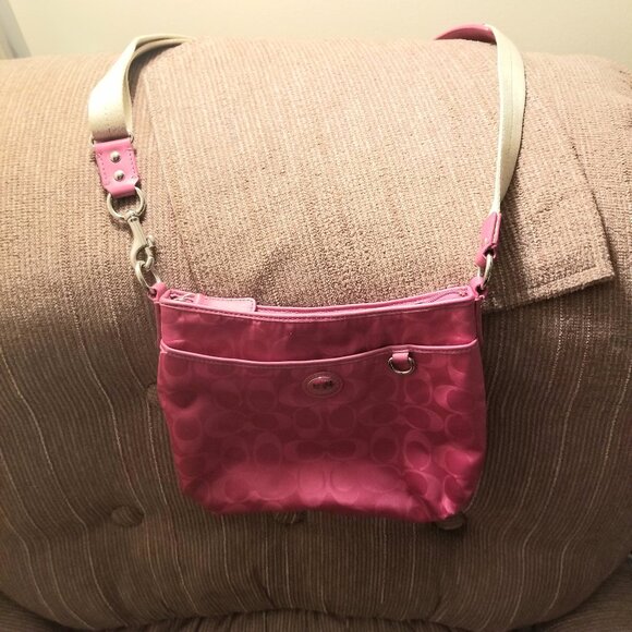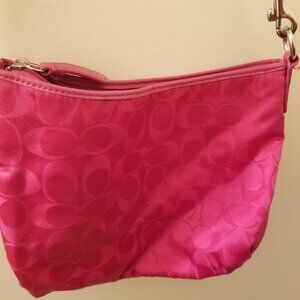 Bright pink Coach signature brand crossbody purse that comes with adjustable strap. One slight worn spot and one loose thread in one of the pictures.